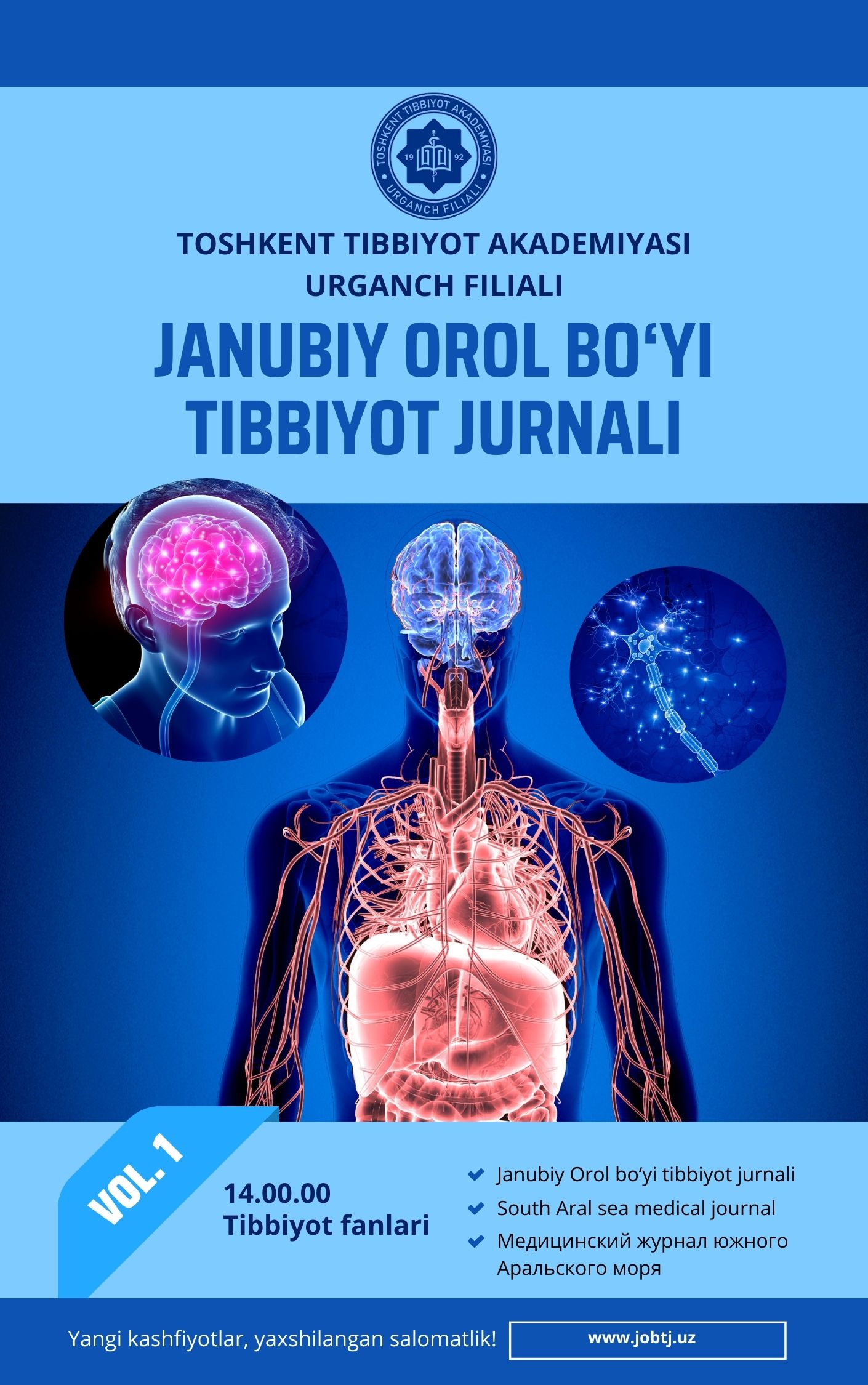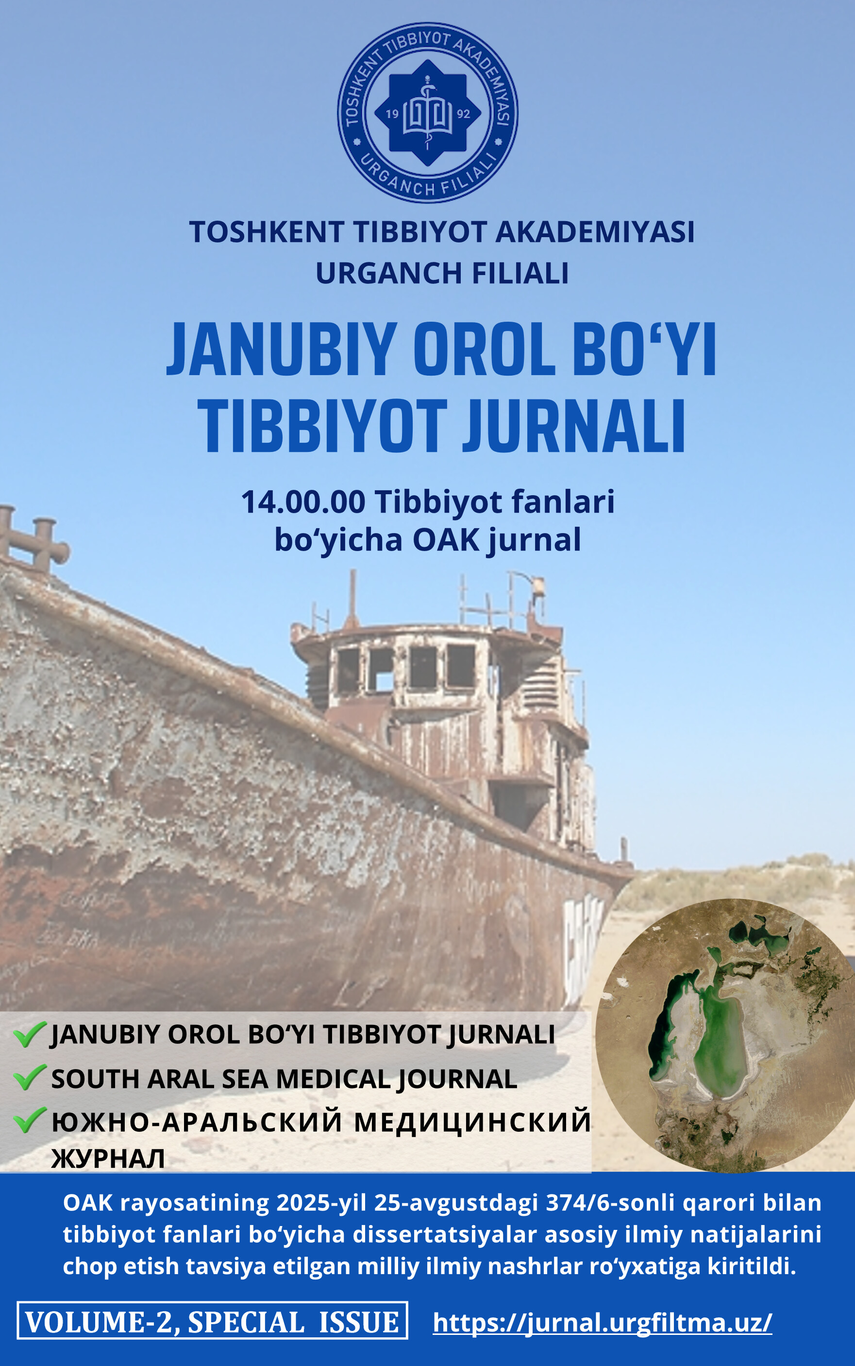 Том 2 № Maxsus son (2026)O‘zbekiston Respublikasi Prezidentining 2020 yil 2-mart kungi «Ilm, ma'rifat va raqamli iqtisodiyotni rivojlantirish yili»da amalga oshirishga oid Davlat dasturi to‘g‘risida»gi Farmonida ko‘zda tutilgan vazifalarni ijrosini ta'minlash maqsadida “Toshkent tibbiyot akademiyasi Urganch filiali” tomonidan ta’sis etilgan “JANUBIY OROL BO‘YI TIBBIYOT JURNALI” ISSN: 3093-8740 ilmiy jurnalining (O‘zbekiston Respublikasi Prezidenti adminstrasiyasi huzuridagi Axborot va ommaviy kommunikasiyalar agentligida 2025-yil 23-iyunda № 846392-raqamli guvohnoma bilan ro‘yhatga olingan. https://journal.urdti.uz/index.php/SARMJ/en veb sayti) 2-tom maxsus soni uchun maqolalar qabuli e’lon qilinadi. OAK rayosatining 2025-yil 25-avgustdagi 374/6-sonli qarori bilan tibbiyot fanlari bo‘yicha dissertatsiyalar asosiy ilmiy natijalarini chop etish tavsiya etilgan milliy ilmiy nashrlar ro‘yxatiga kiritildi.