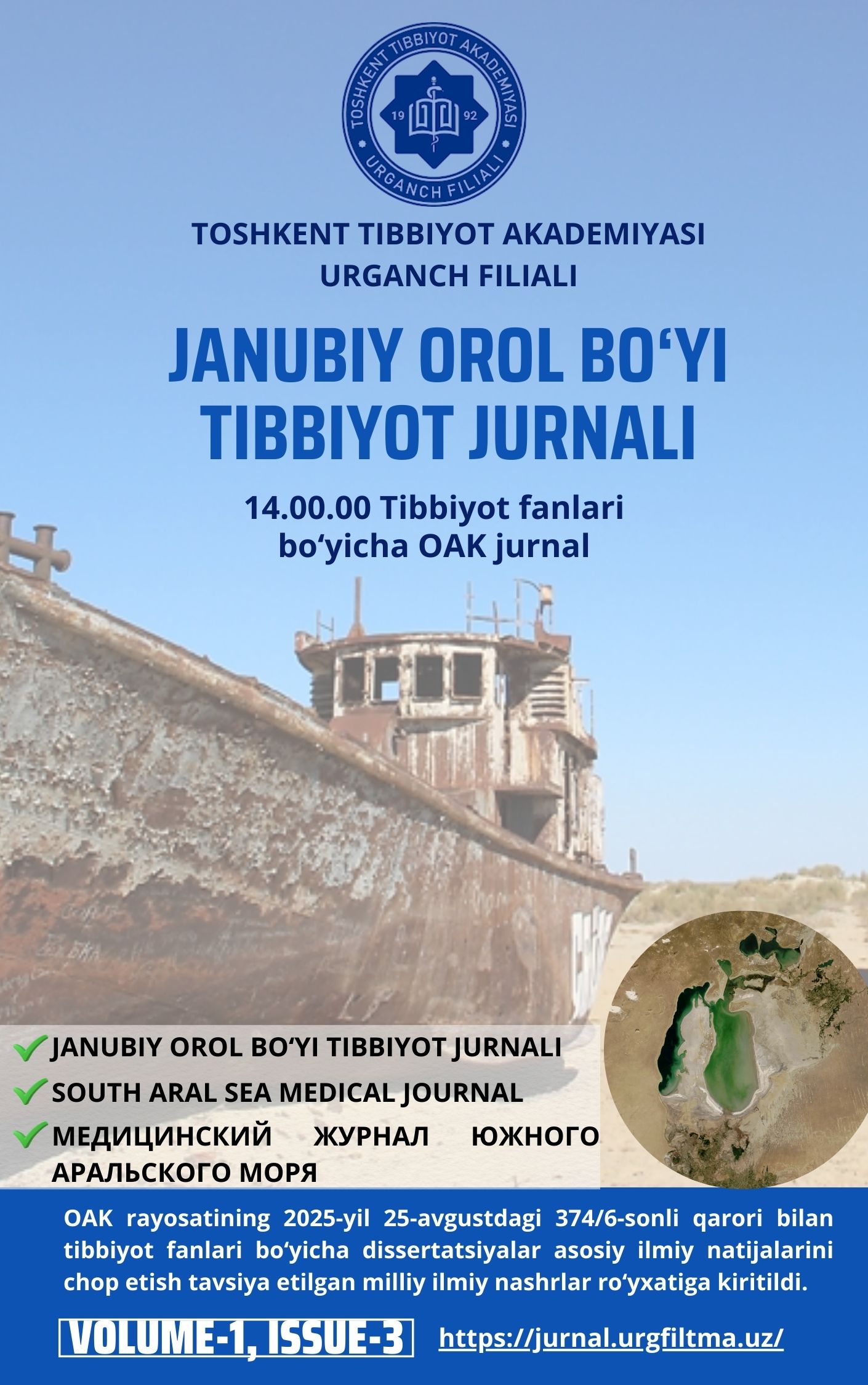 Том 1 № 3 (2025)O‘zbekiston Respublikasi Prezidentining 2020 yil 2-mart kungi «Ilm, ma'rifat va raqamli iqtisodiyotni rivojlantirish yili»da amalga oshirishga oid Davlat dasturi to‘g‘risida»gi Farmonida ko‘zda tutilgan vazifalarni ijrosini ta'minlash maqsadida “Toshkent tibbiyot akademiyasi Urganch filiali” tomonidan ta’sis etilgan “JANUBIY OROL BO‘YI TIBBIYOT JURNALI” ISSN: 3093-8740 ilmiy jurnalining (O‘zbekiston Respublikasi Prezidenti adminstrasiyasi huzuridagi Axborot va ommaviy kommunikasiyalar agentligida 2025-yil 23-iyunda № 846392-raqamli guvohnoma bilan ro‘yhatga olingan. https://journal.urdti.uz/index.php/SARMJ/en veb sayti) OAK rayosatining 2025-yil 25-avgustdagi 374/6-sonli qarori bilan tibbiyot fanlari bo‘yicha dissertatsiyalar asosiy ilmiy natijalarini chop etish tavsiya etilgan milliy ilmiy nashrlar ro‘yxatiga kiritildi.